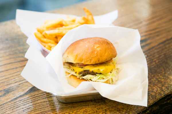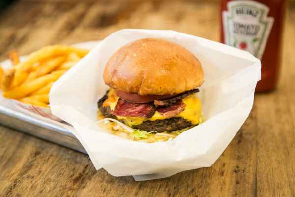 Smashed chuck patty topped with American cheese, holy sauce, lettuce, tomato, and onion.