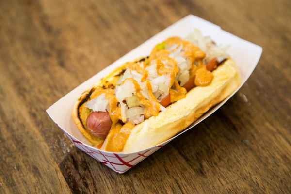 Hot dog served with choice of onion, relish, ketchup, mustard, Peri Peri or Holy Sauce.