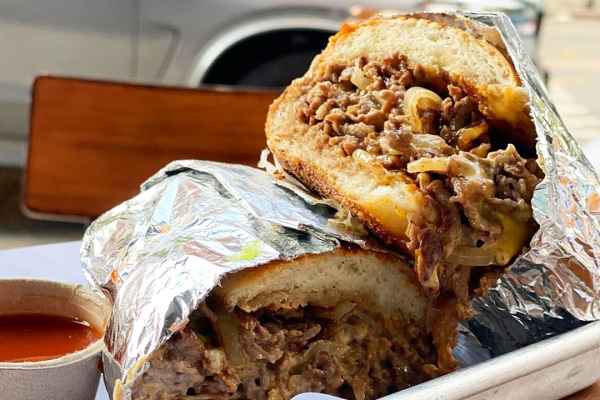 7 oz shaved premium ribeye, grilled onion, jalapeno and American cheese sandwich.